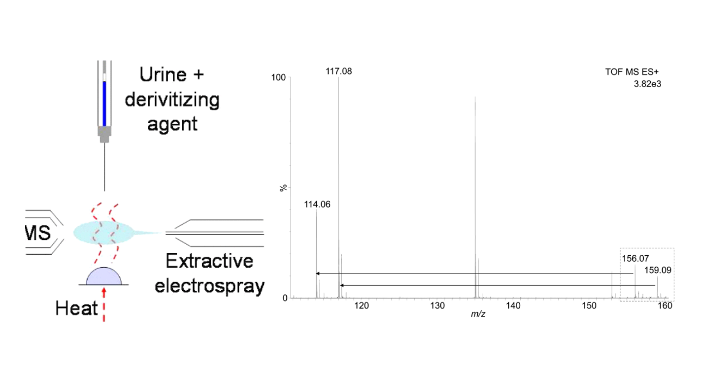 A direct, ambient ionization method has been developed for the determination of creatinine in urine that combines derivatization and thermal desorption with extractive electrospray ionization and ion mobility-mass spectrometry. The volatility of creatinine was enhanced by a rapid on-probe aqueous acylation reaction, using a custom-made thermal desorption probe, allowing thermal desorption and ionization of the monoacylated derivative. The monoacyl creatinine [M + H]+ ion (m/z 156) was subjected to mass-to-charge selection and collision induced dissociation to remove the acyl group, generating the protonated creatinine [M + H]+ product ion at m/z 114 before an ion mobility separation was applied to reduce chemical noise. Stable isotope dilution using creatinine-d3 as internal standard was used for quantitative measurements. The direct on-probe derivatization allows high sample throughput with a typical cycle time of 1 min per sample. The method shows good linearity (R2 = 0.986) and repeatability (%RSD 8–10%) in the range of 0.25–2.0 mg/mL. The creatinine concentrations in diluted urine samples from a healthy individual were determined to contain a mean concentration of 1.44 mg/mL creatinine with a precision (%RSD) of 9.9%. The reactive ambient ionization approach demonstrated here has potential for the determination of involatile analytes in urine and other biofluids.